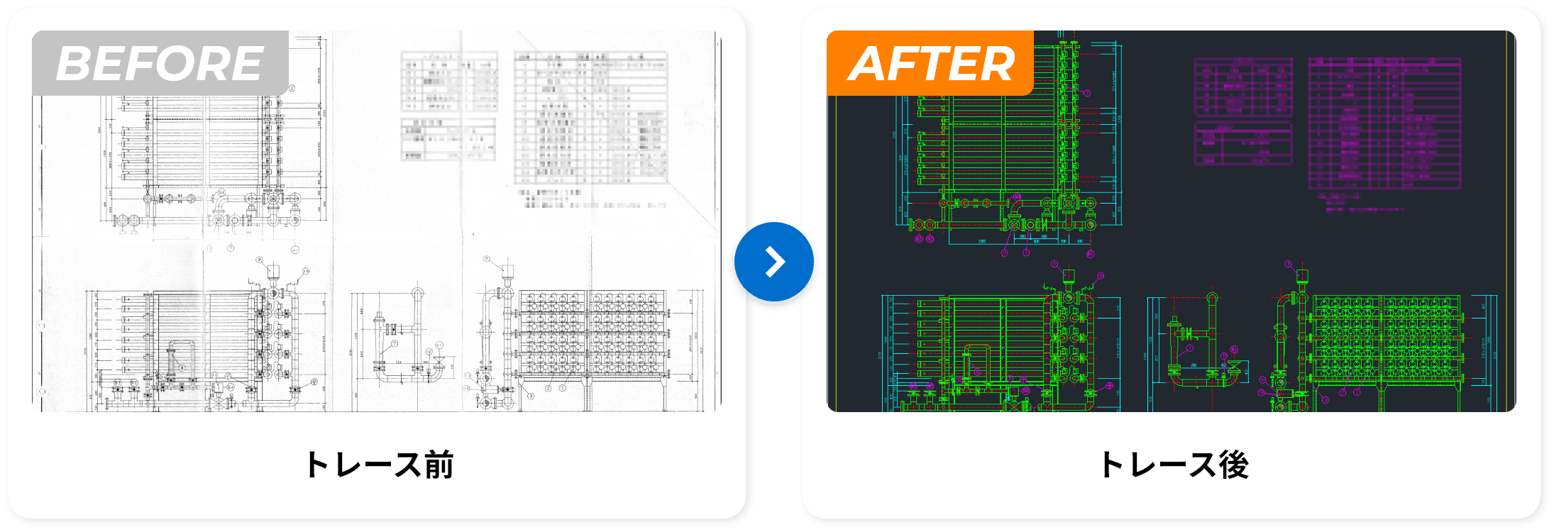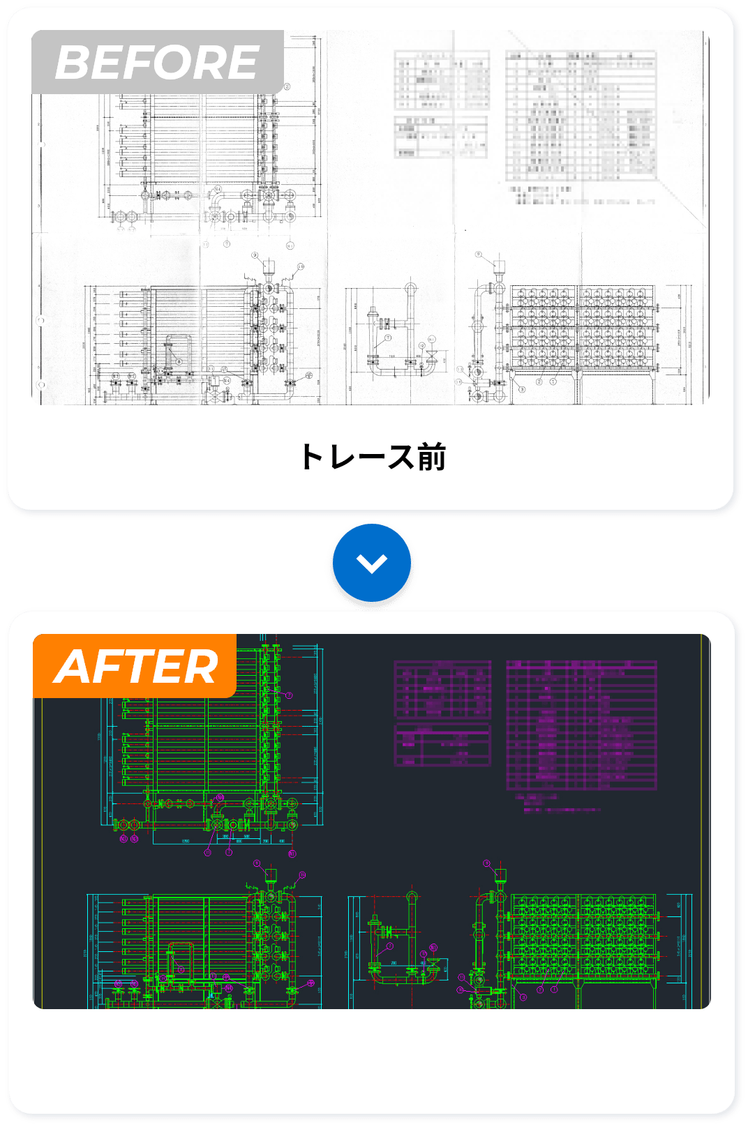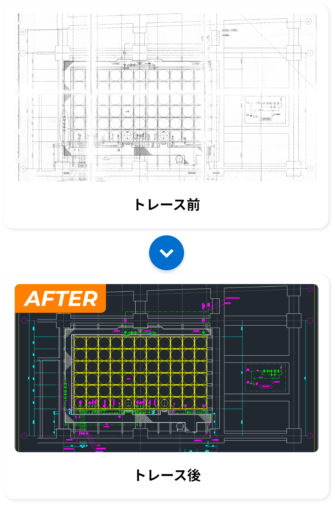| 対象図面 | 電気・設備図面(配管系統図・配線系統図・機器設備図・展開接続図、等) 建築・工事図面(施工図・組立図・断面図・立面図・平面詳細図・配置図、等) 土木図面(平面図・縦断面図・横断面図・構造図・詳細図・用排水系統図、等) |